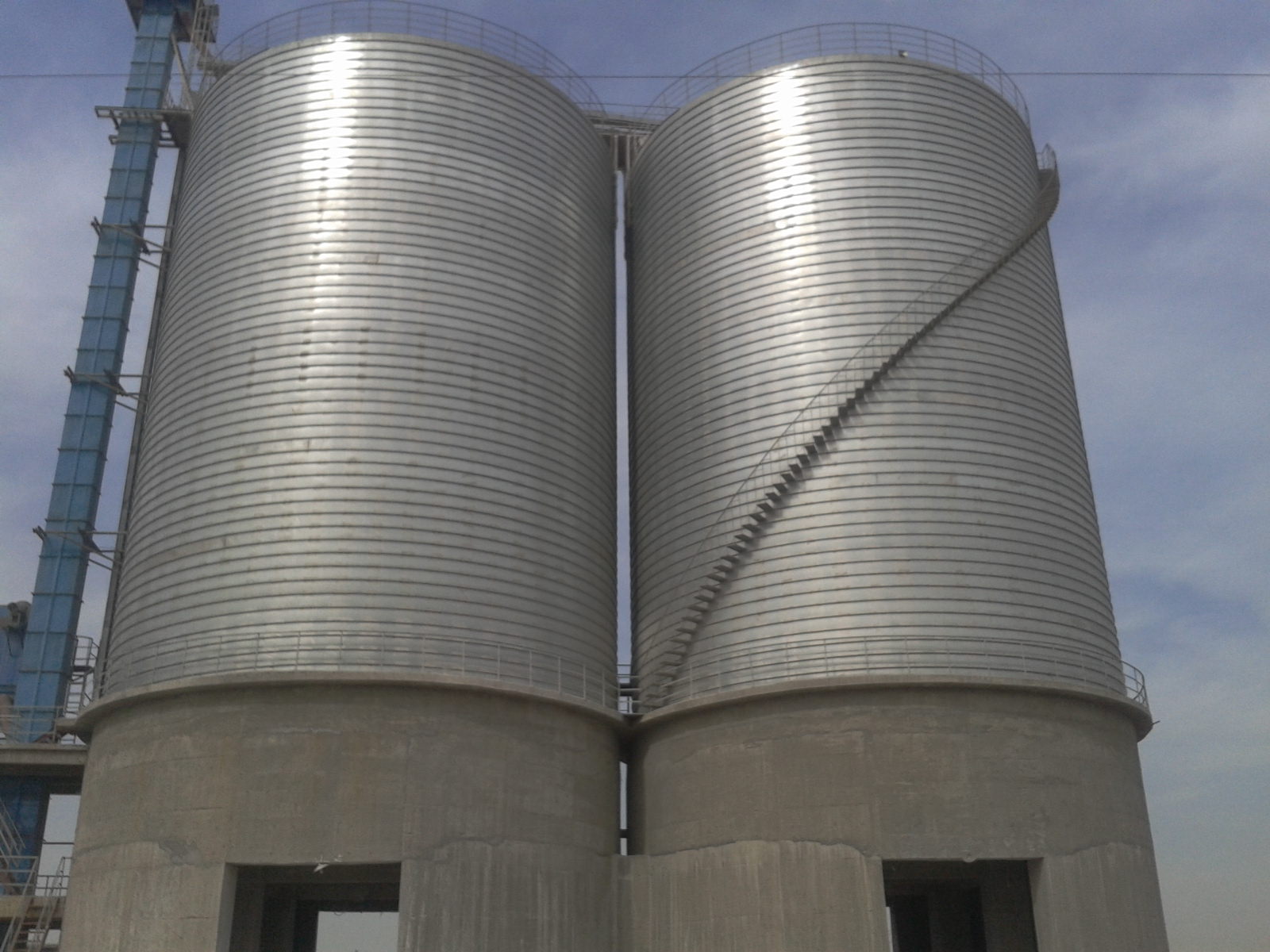 1;钢板仓在建造过程中,完全由专用设备施工,螺旋咬合钢板仓专用设备由承载机架、开卷机、弯折机和成型机组成,在卷制过程中,将495 mm宽的卷板送入成型机扎制成所需的几何形状,再通过折弯机弯折、咬口、仓体外壁咬制成一条五倍于材料厚度 30mm-40mm宽的螺旋凸条,大大加强了仓体的承载能力,使钢板仓的整体强度、稳定性、抗震性优于其它池罐。另外,利蒲仓采用的材料是防腐性能特别强的镀锌钢板,利浦钢板仓的仓体直径在5---20m以内选择,高度可在30m以下选用,这使得它的寿命也比其它池罐长。